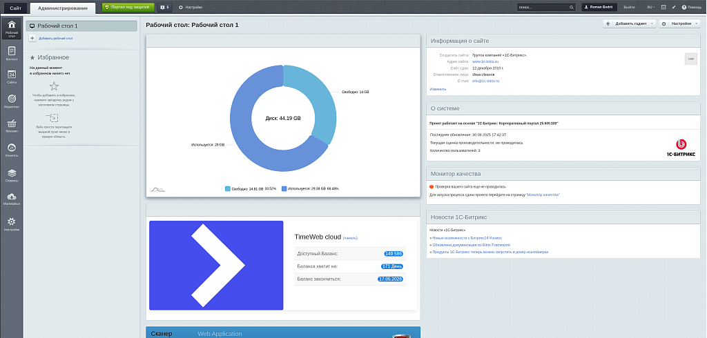 Администратор вашего сайта (или Битрикс24 портала), каждый день видит эти виджеты в административной панели и не сможет упустить из внимания критическую ситуацию, когда место на диске будет заканчиваться или баланс вашего хостинга будет подходить к концу.