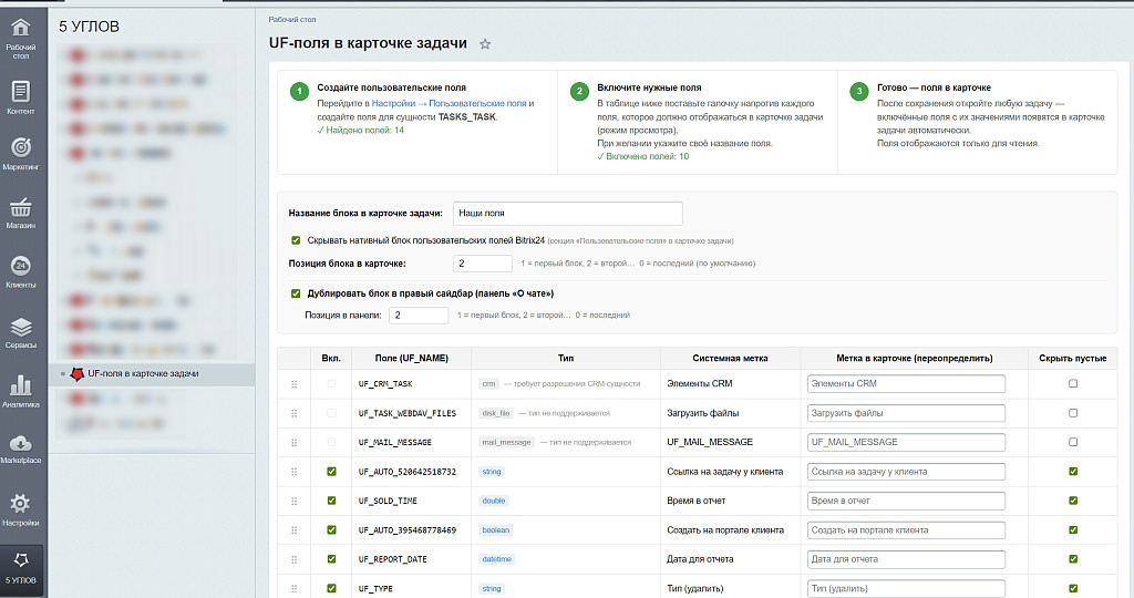 Поможем с настройкой "5 УГЛОВ. Задачи - пользовательские поля в карточке задачи"