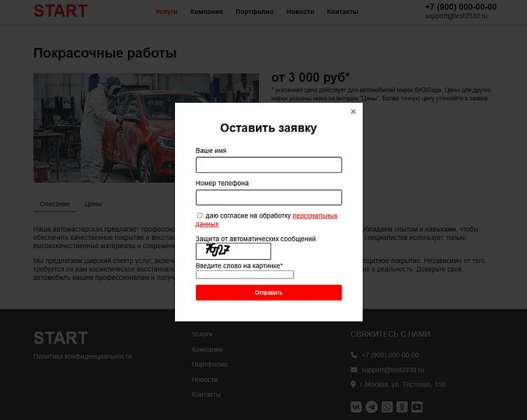 - страница услуг с формой заявки