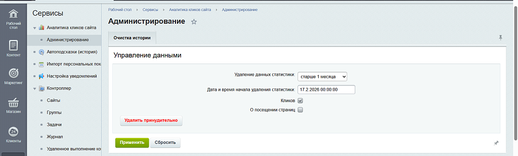 - о кликах пользователей сайта (как для лицензий Битрикс Управление Сайтов, так и для лицензий Битрикс24) на любых страницах за определенный период времени;