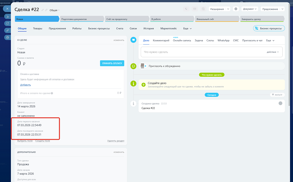 - «Дата первого касания»: Заполняется автоматически один раз при самом первом зафиксированном действии. Дата не перезаписывается, позволяя точно определить момент входа клиента в воронку.