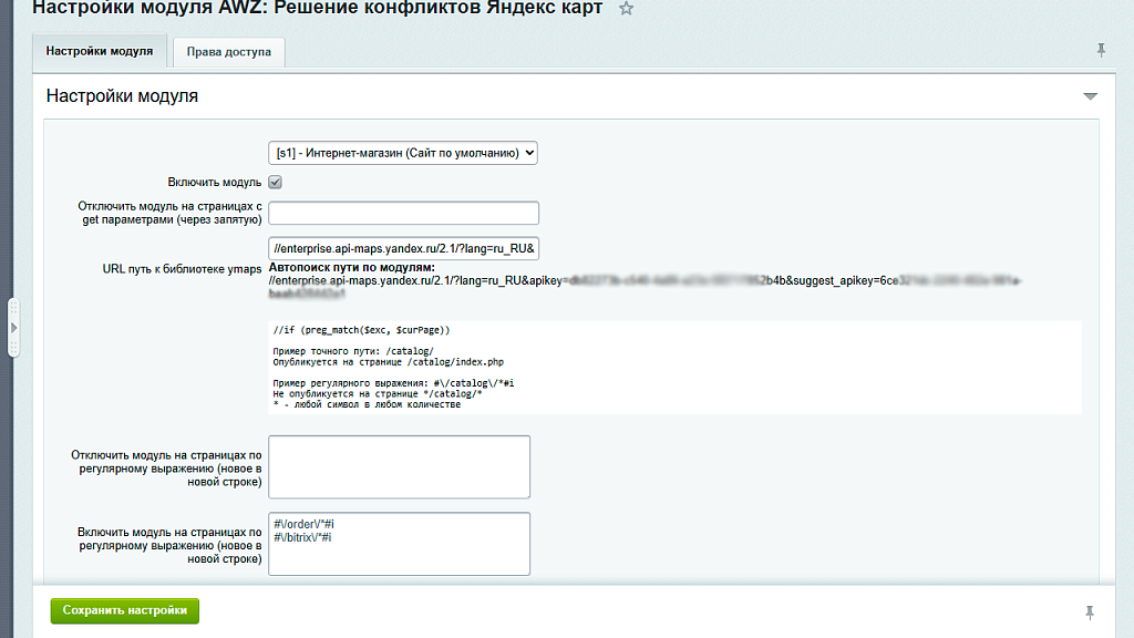 - Настройки: Доступны через раздел "Настройки модулей" → "Настройки модуля AWZ: Решение конфликтов Яндекс карт".