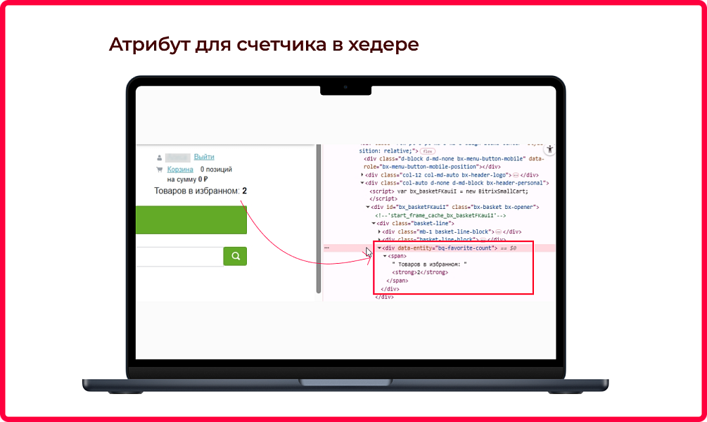 Добавьте в шаблон сайта элементы с конкретными атрибутами: кнопку для добавления товара в избранное, блок для отображения избранного в шапке сайта. Нужные атрибуты и примеры кода мы указали на вкладке “Установка”.