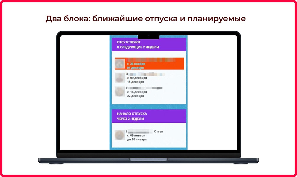Виджет состоит из двух настраиваемых блоков для лучшего разделения предстоящих отсутствий на ближайшие и отдаленные по времени.