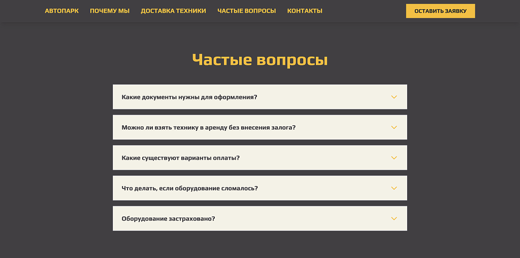 - Часто задаваемые вопросы (FAQ) — аккордеон с вопросами и ответами (документы для оформления, залог, оплата, поломки, страхование)