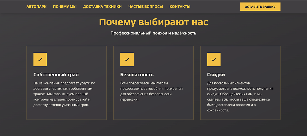 - Преимущества (Features) — 4 карточки с основными преимуществами (собственный автопарк, работа без выходных, с оператором или без, гибкие условия)