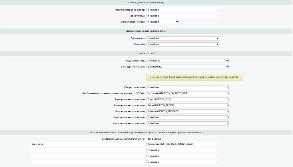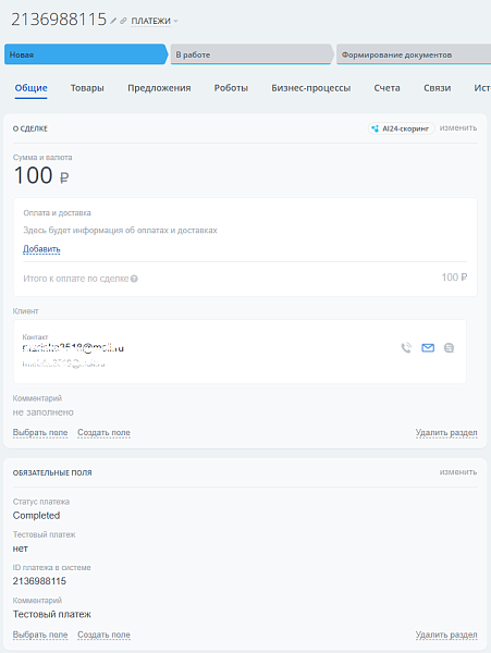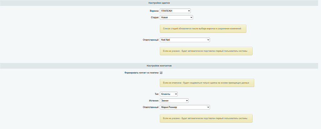 На основе полученных данных создается 2 сущности: сделка (информация о платеже) и контакт (информация о плательщике).