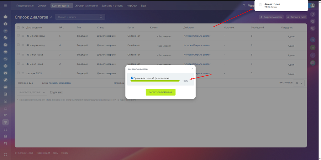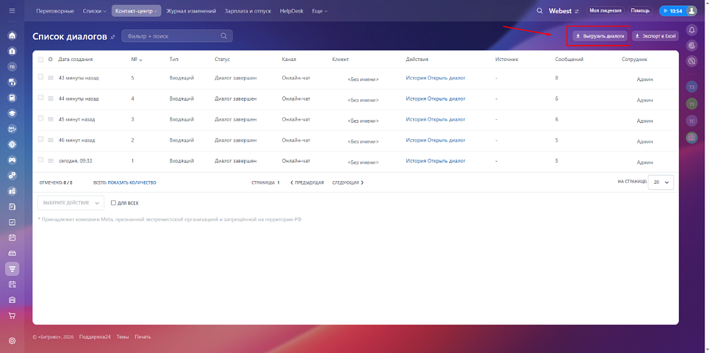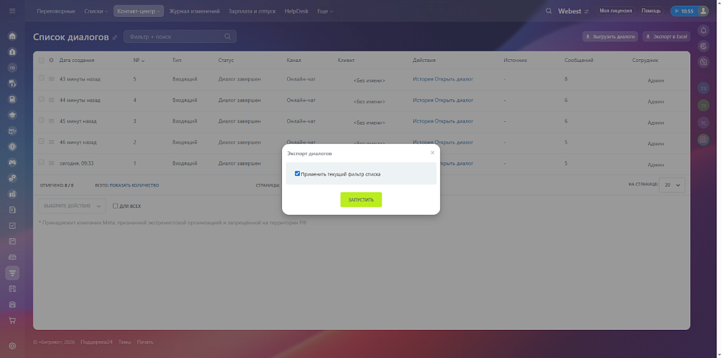 Сотрудники продолжают работать в стандартном разделе Контакт-центра и могут выполнять экспорт: