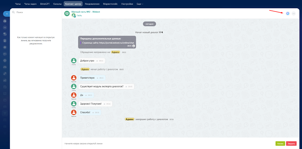 Экспорт из конкретного диалогаЕсли требуется выгрузить отдельную переписку, экспорт доступен непосредственно из карточки диалога.