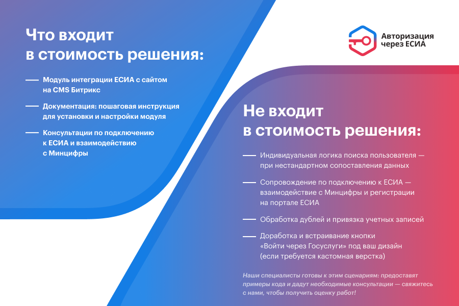 Чтобы реализовать авторизацию на сайте через Госуслуги, помимо подключения модуля необходимы: сложная настройка криптографических средств, получение сертификатов от Минцифры и регистрация ИС на портале ЕСИА – это то, что ждёт вас на самом деле при подключении к ЕСИА. Наша техподдержка готова к этим задачам (не включено в стоимость решения):