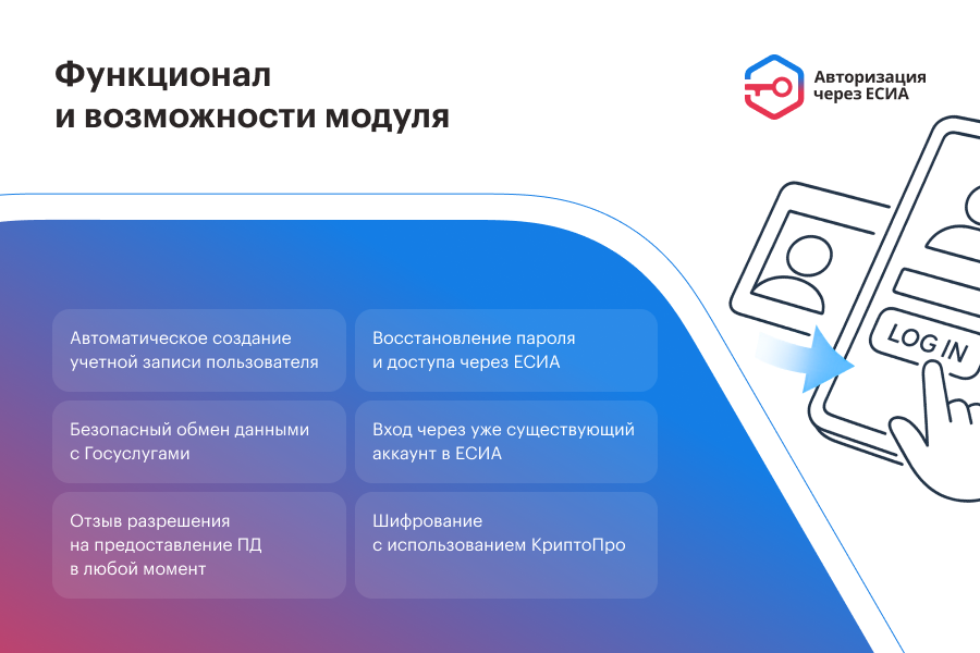 Поддержка авторизации ЕСИА на сайте Госуслуги: автоматическое создание аккаунта пользователя при первом входе на ваш сайт.