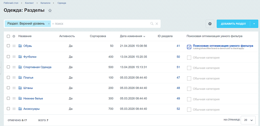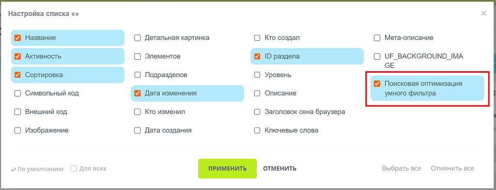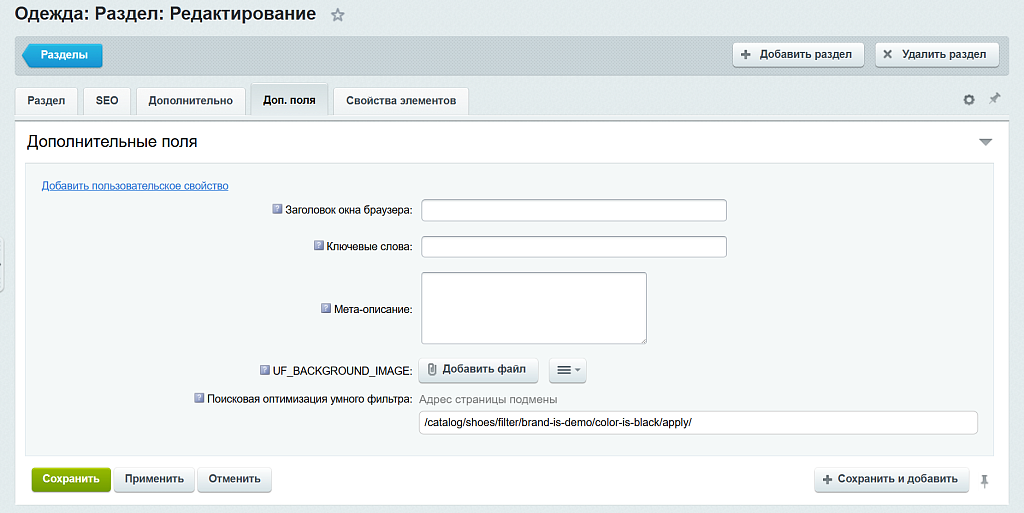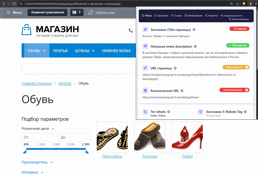 - настройка заголовков, описаний и метаданных для страниц фильтра и поиска;