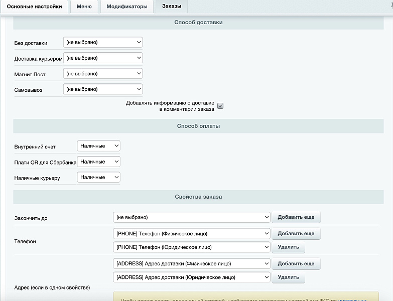- использовать разные организации для меню и для заказов, в случае если у вас меню сделано только в одной организации