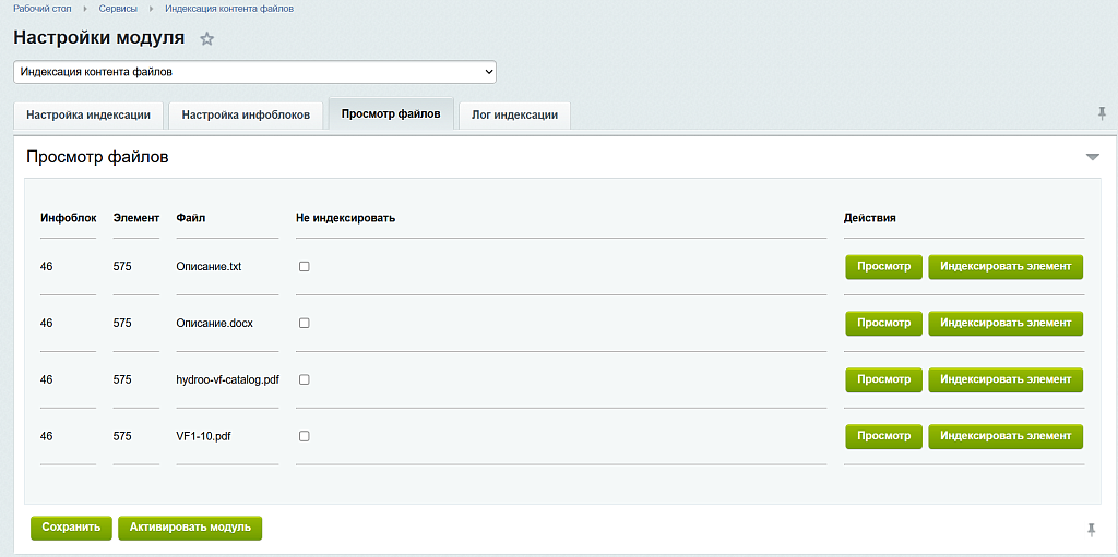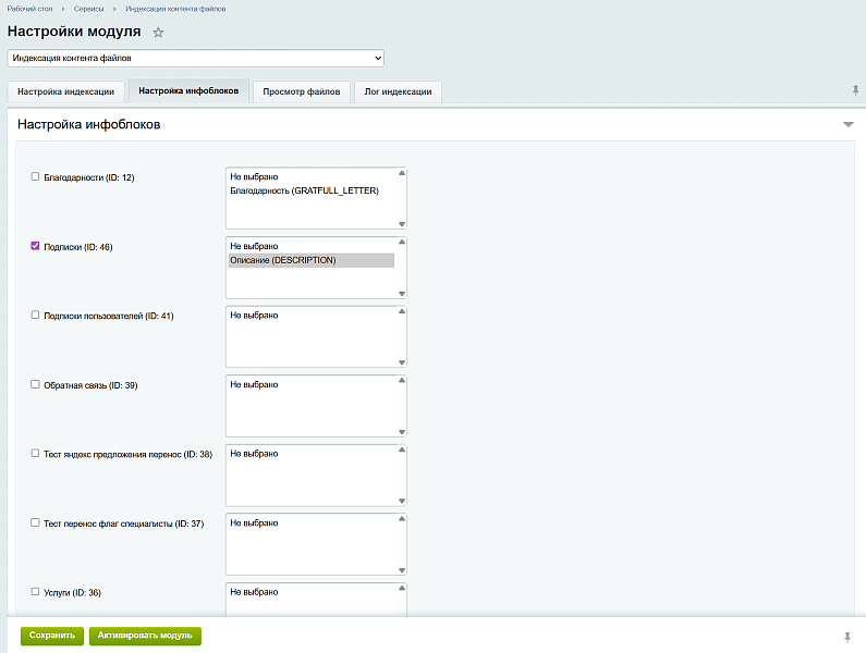Гибкая настройка инфоблоков: Вы можете точечно указать, для каких информационных блоков и каких именно свойств типа «Файл» необходимо выполнять индексацию.