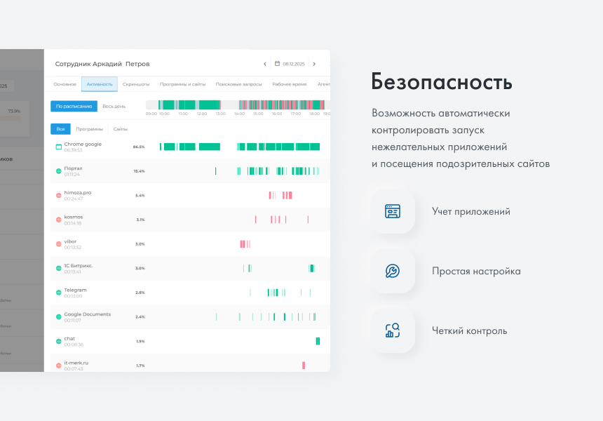 Эффективность. Отражает картину продуктивности отдельного работника или подразделения. С помощью этого отчета вы узнаете, какие сайты посещают сотрудники в рабочее время, какие приложения и программы используют.