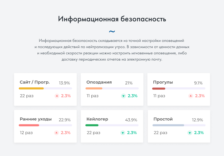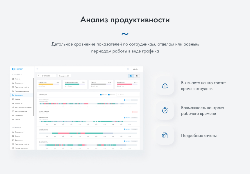 Вы сможете оценить продуктивность каждого сотрудника или подразделения в целом. Программа позволит выявить лидеров и аутсайдеров