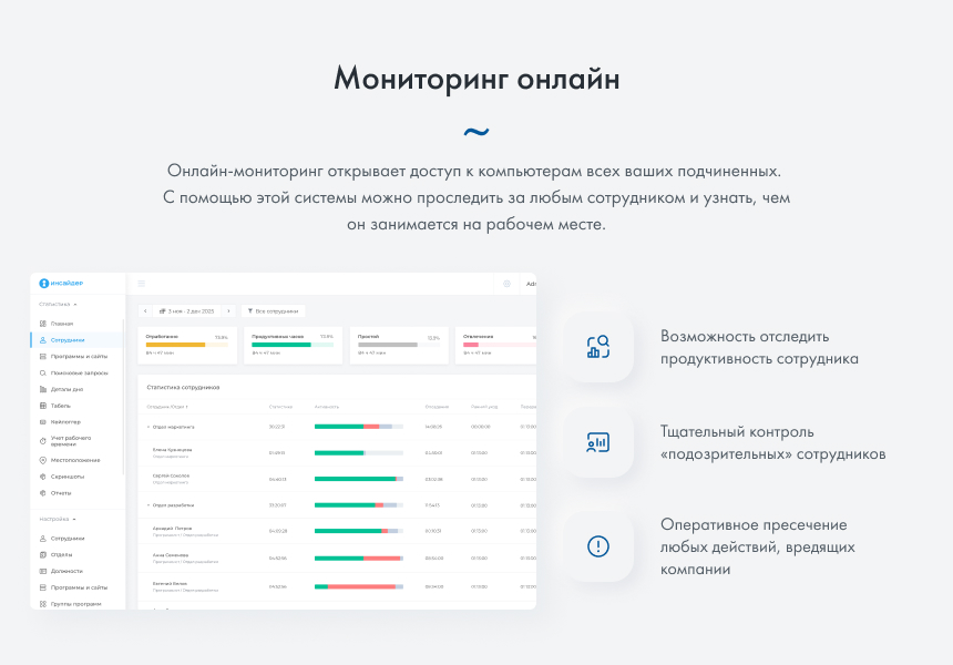 Мониторинг рабочих компьютеров – более эффективная мера, чем блокировка сайтов. Согласитесь, запретить доступ ко всем непродуктивным сайтам невозможно. Система мониторинга воздействует на психологию сотрудников, за счет чего они будут работать более продуктивно. Инсайдер покажет руководителю реальную картину продуктивности подчиненных.