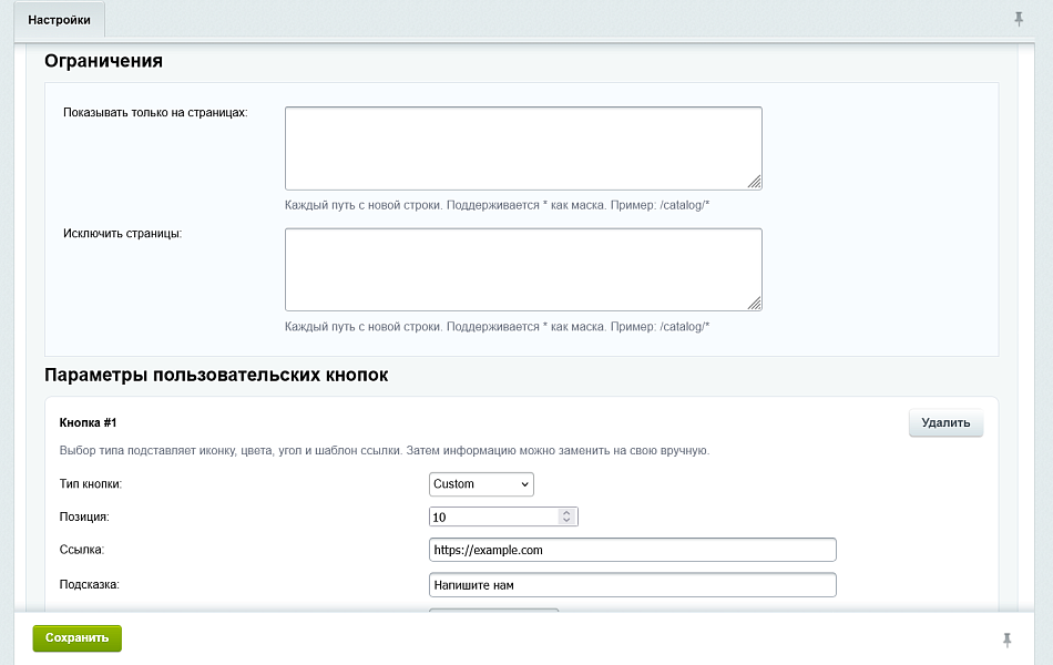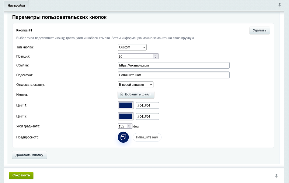 Каждая кнопка может быть настроена отдельно: тип, порядок показа, ссылка, текст подсказки, целевое окно, иконка, а также градиентное оформление. Настройки доступны отдельно для каждого сайта в многосайтовой конфигурации.