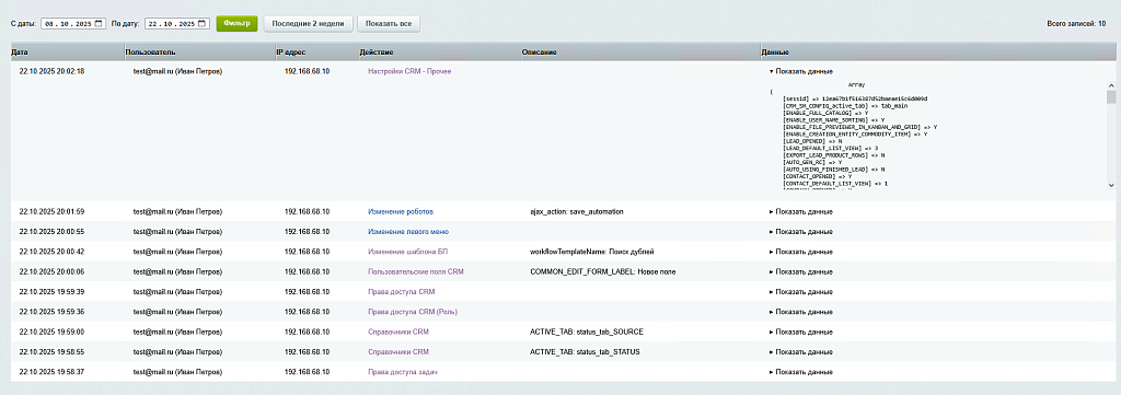Решение ;«Контроль настроек» возвращает вам власть. Это единый журнал аудита, который отображает все ключевые изменения ваших сайтов 1С-Битрикс и порталов Битрикс24 (коробочная версия). Узнайте, кто и когда внес изменения в следующих настройках: