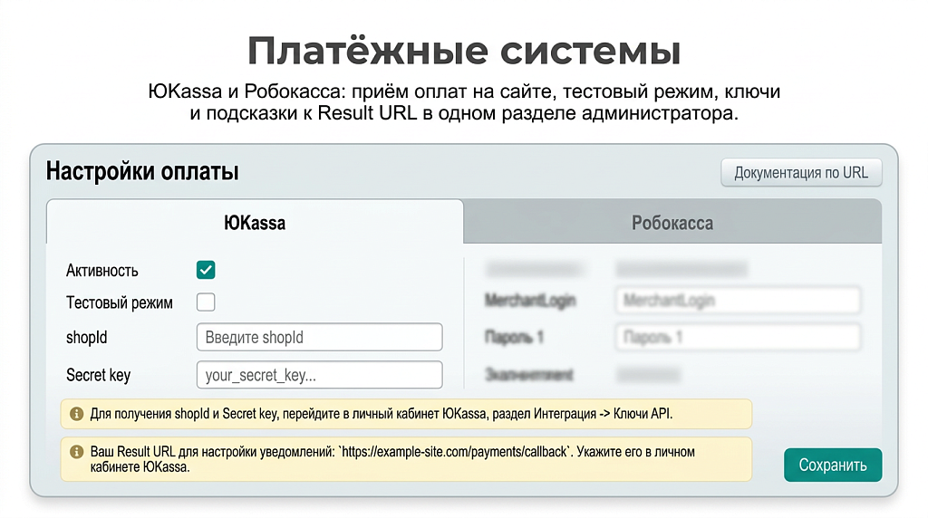 Онлайн-оплата: ЮKassa и Робокасса (настройка в разделе Платежные системы).