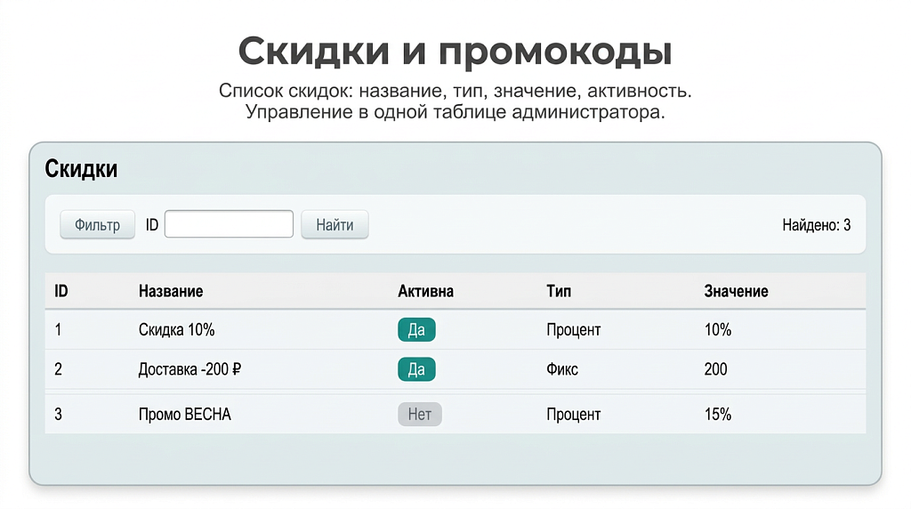 Скидки и купоны — отдельный функционал в администрировании модуля.