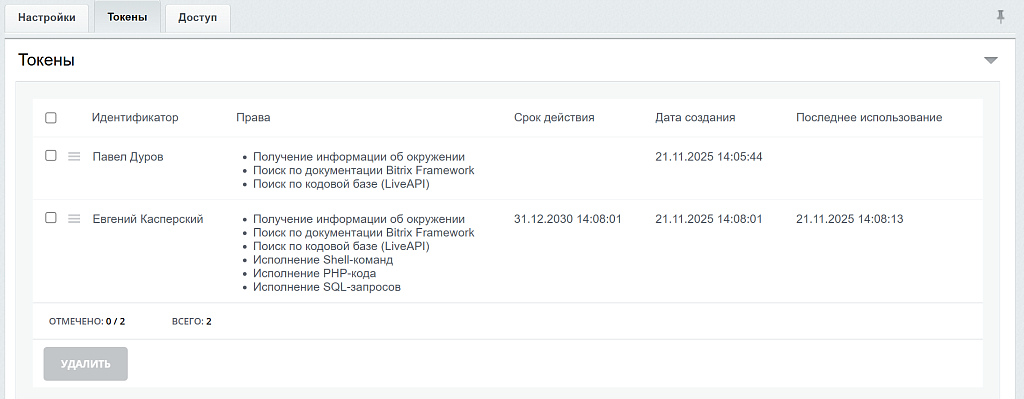 Токены с правами на исполнение PHP/Shell/SQL кода рекомендуется использовать только на тестовых площадках! Помните, что AI-агенты ошибаются и могут удалить или испортить ваши данные.