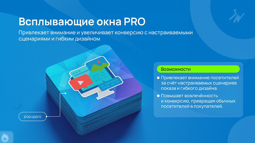 ⭐ Всплывающие окна PRO - это гибкий инструмент для привлечения внимания и роста конверсии. Настраиваемые сценарии позволяют показывать окна именно тогда, когда это нужно: при уходе со страницы, при просмотре определённых товаров или по таймеру. Гибкий дизайн и таргетинг помогают превратить посетителей в покупателей и увеличить вовлечённость аудитории.
