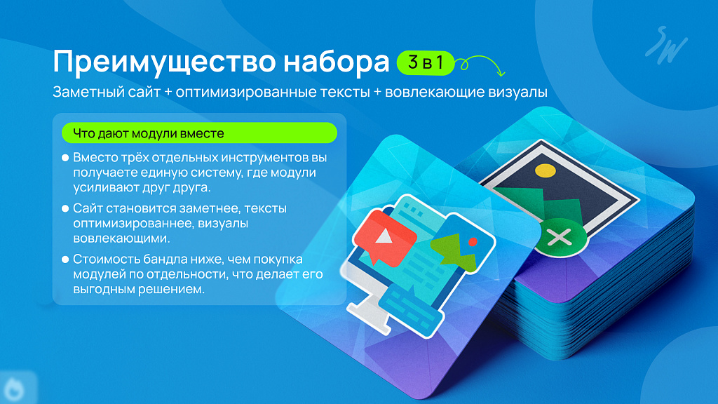 ✅ Приобретая набор, вы получаете не просто три отдельных инструмента, а единую систему для работы с контентом. Она помогает привлекать внимание, создавать оптимизированные тексты и превращать изображения в интерактивный опыт. Вместе эти возможности усиливают друг друга и дают комплексный результат: больше вовлечённости, выше позиции в поиске и рост конверсии.