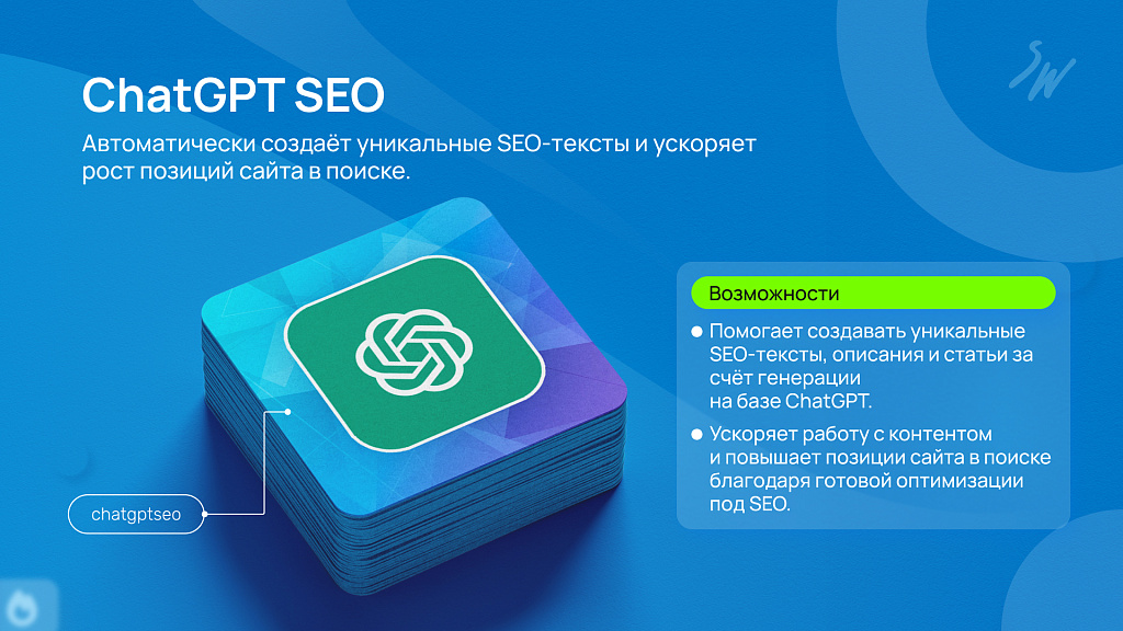 ⭐ ChatGPT: SEO генератор - интеллектуальный помощник для создания уникального контента. Он автоматически формирует SEO‑оптимизированные тексты: описания товаров, статьи и мета‑теги. Это ускоряет работу редакторов и маркетологов, повышает позиции сайта в поисковых системах и помогает привлекать больше органического трафика.
