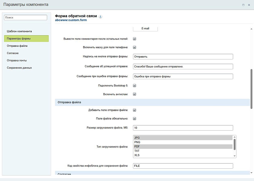 Данные отправленной формы можно сохранить в инфоблок (выбирается в настройках), список отправленных полей сохраняется в поле "описание анонса", для сохранения отправленного файла в инфоблоке необходимо добавить свойство типа файл и указать его символьный код в настройке "Код свойства инфоблока для сохранения файла".