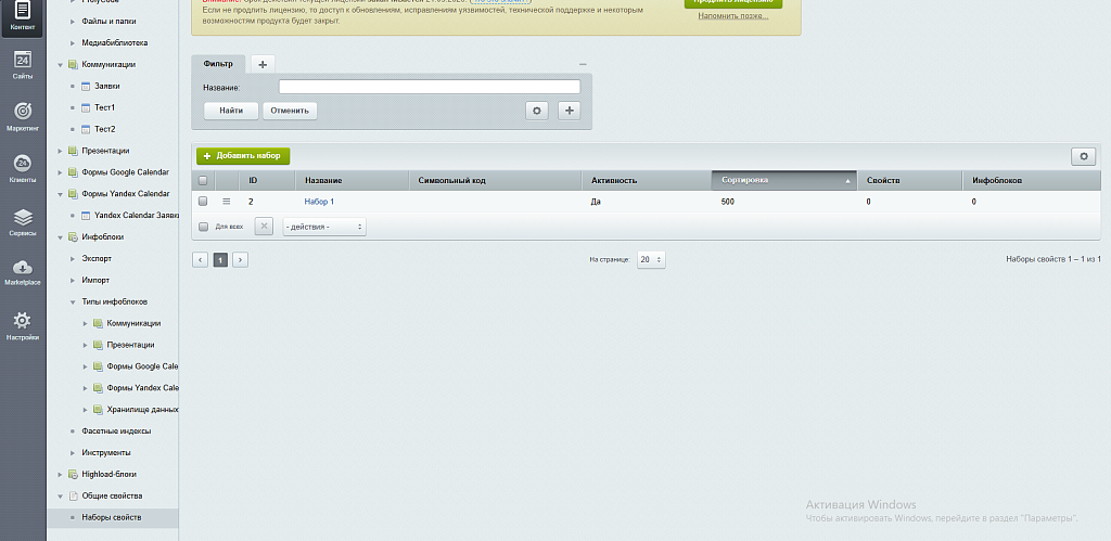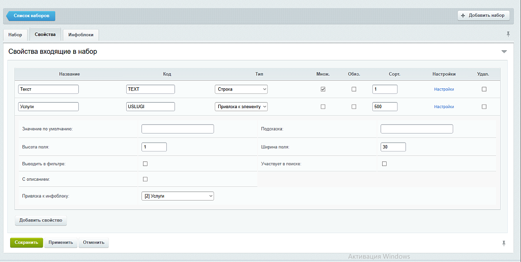 - При удалении набора или свойства из набора — соответствующие свойства автоматически удаляются из инфоблоков