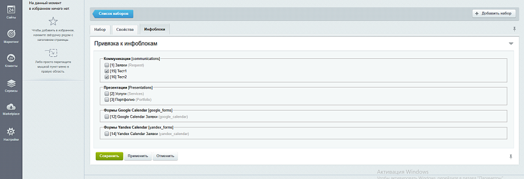 - Привязка набора к любому количеству инфоблоков