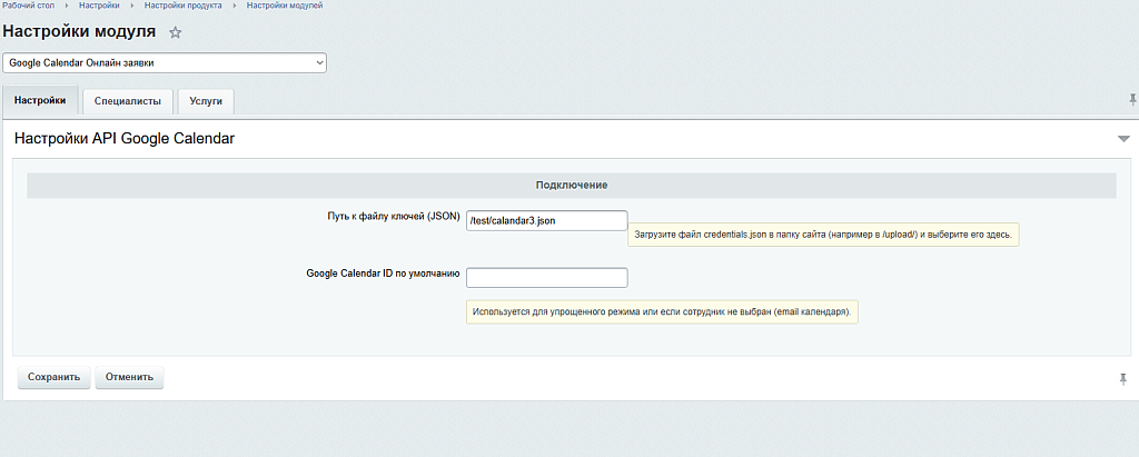- Перейдите в настройки модуля: Настройки -> Настройки модулей -> Google Calendar Онлайн-Запись.