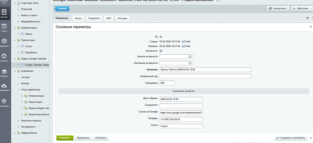 - Интеграция с Инфоблоками: Все заявки дублируются в специальный инфоблок "Google Calendar Заявки" (создается автоматически). Это база ваших лидов внутри Битрикса.