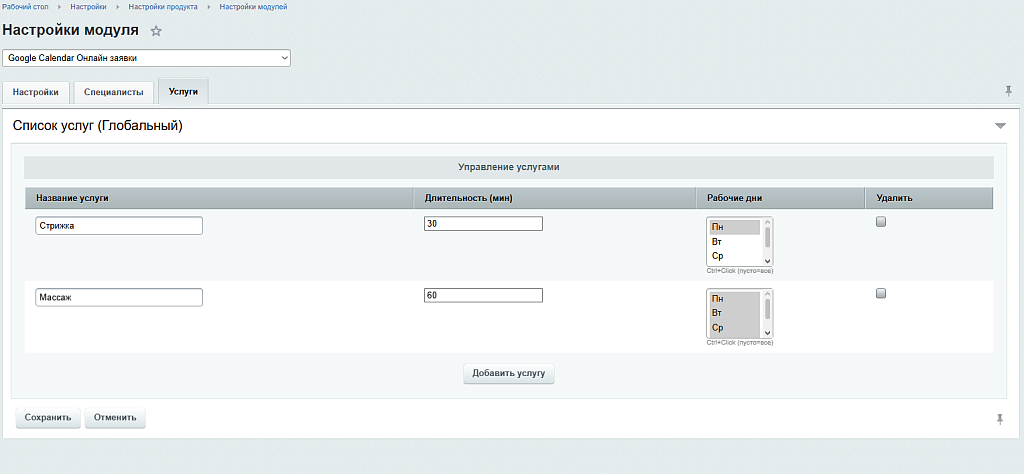 - Там же вы можете настроить Глобальный список услуг и специалистов.