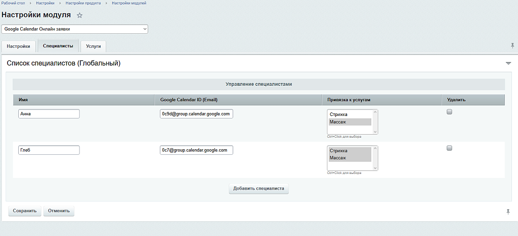 - Требует настройки "Специалистов" в настройках модуля.