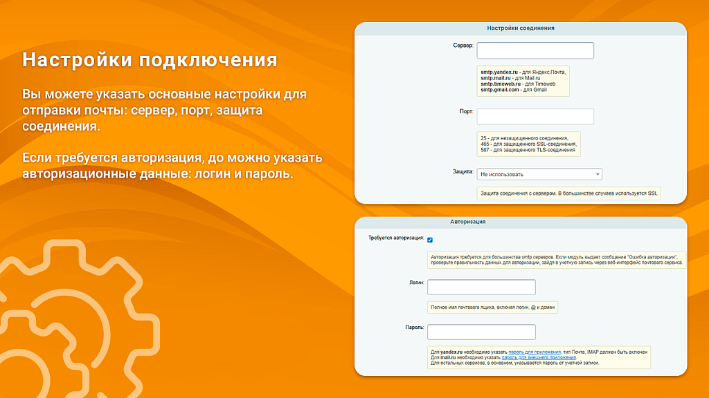 Вы можете указать основные настройки для отправки почты: сервер, порт, защита соединения. Если требуется авторизация, до можно указать авторизационные данные: логин и пароль.