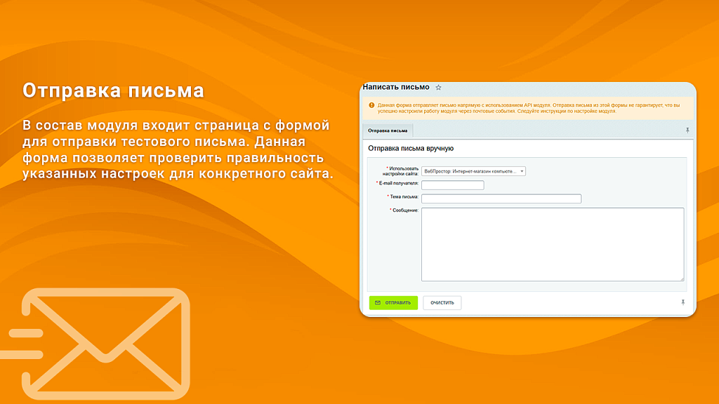 В состав модуля входит страница с формой для отправки тестового письма. Данная форма позволяет проверить правильность указанных настроек для конкретного сайта.
