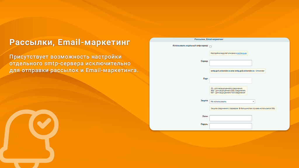 Присутствует возможность настройки сервера для отправки рассылок и Email-маркетинга.