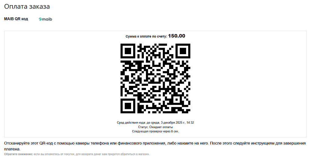 Платежный модуль QR-платежей MAIB позволит принимать оплату на Вашем сайте с использованием MIA QR-кодов через MAIB.