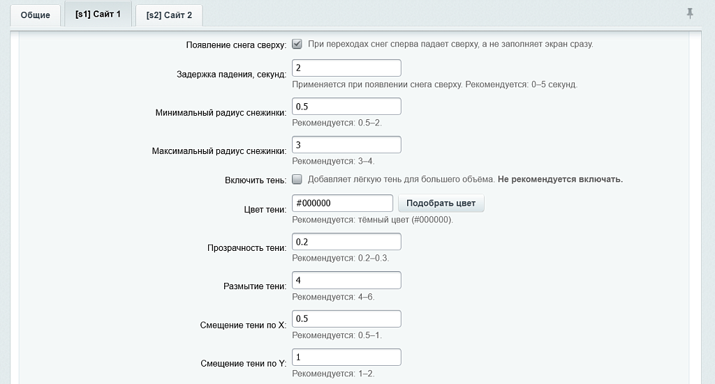 На странице настроек есть поле предпросмотра — в нём снег обновляется при изменении значений, что позволяет сразу увидеть итоговый вид без сохранения.