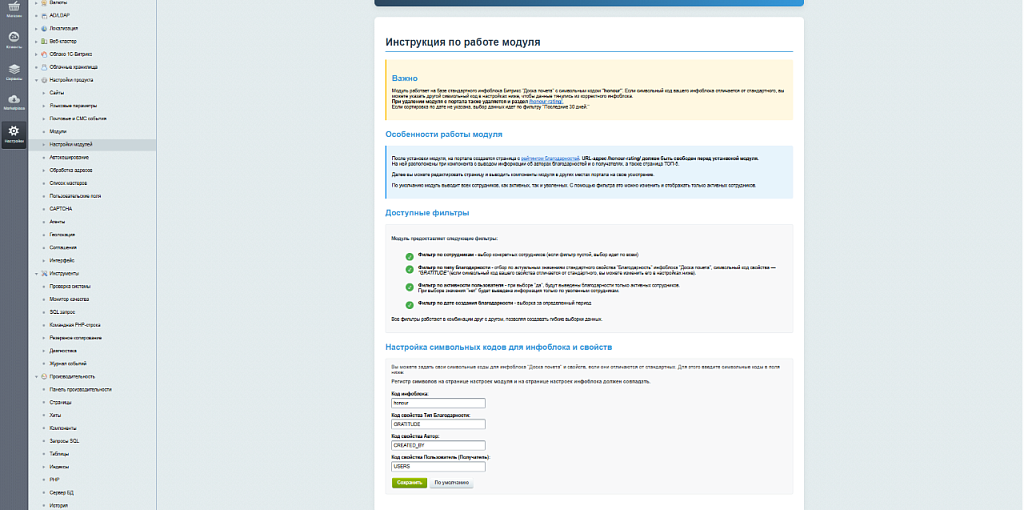 Если на портале используется другой символьный код инфоблока или свойств, их можно указать в настройках модуля.
