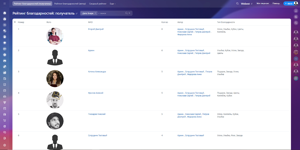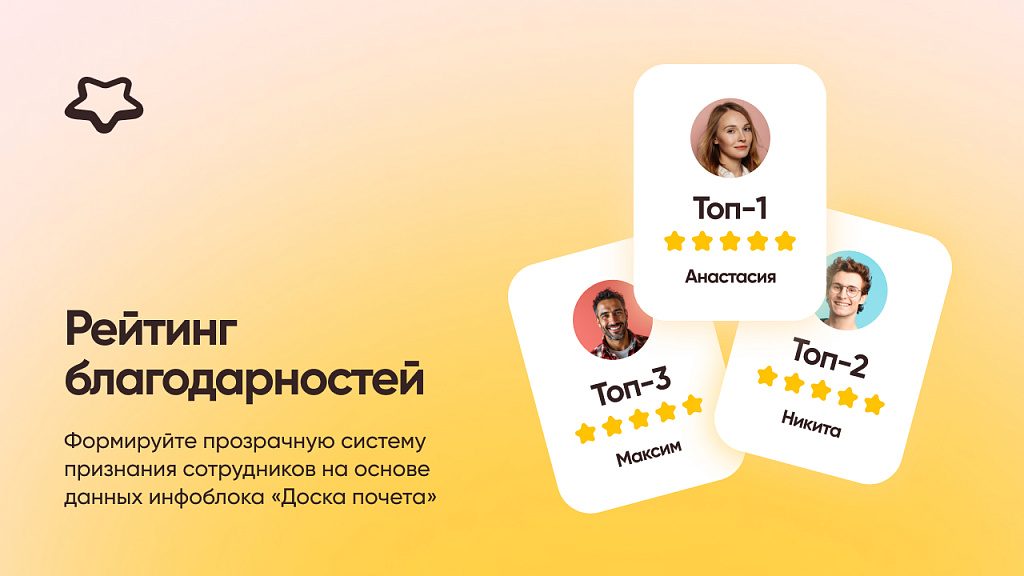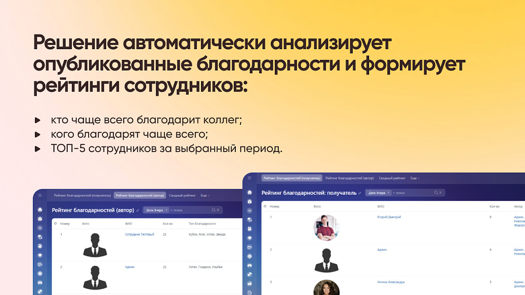 Решение автоматически анализирует опубликованные благодарности и формирует рейтинги сотрудников: