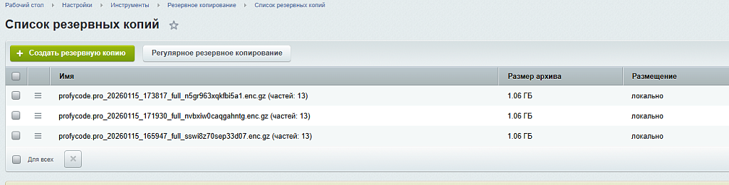 - Совместимость со стандартными настройками резервного копирования в Битрикс