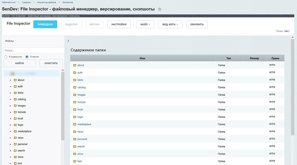 SenDev: File Inspector — профессиональный инструмент для технического аудита и управления файловой системой проекта на 1С-Битрикс. В отличие от стандартных решений, он предлагает не просто просмотр файлов, а полноценную систему контроля версий и анализа изменений.