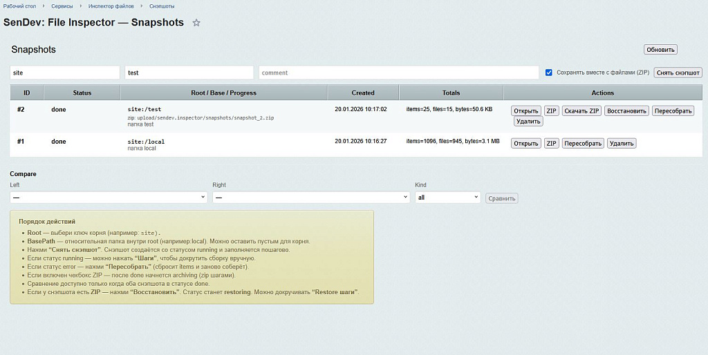 Вопрос: Можно ли восстановить файлы из снапшота?Ответ: Да. Модуль может создать ZIP-архив снапшота и затем восстановить из него файлы с сохранением оригинальных прав (chmod) и временных меток (mtime).