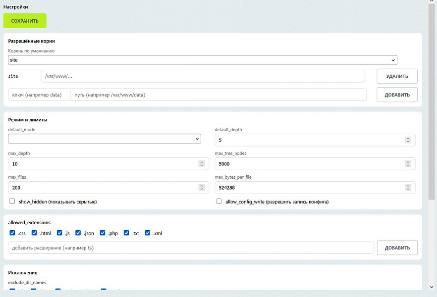 - Полный контроль через настройки: корни, расширения, глубина обхода, лимиты памяти