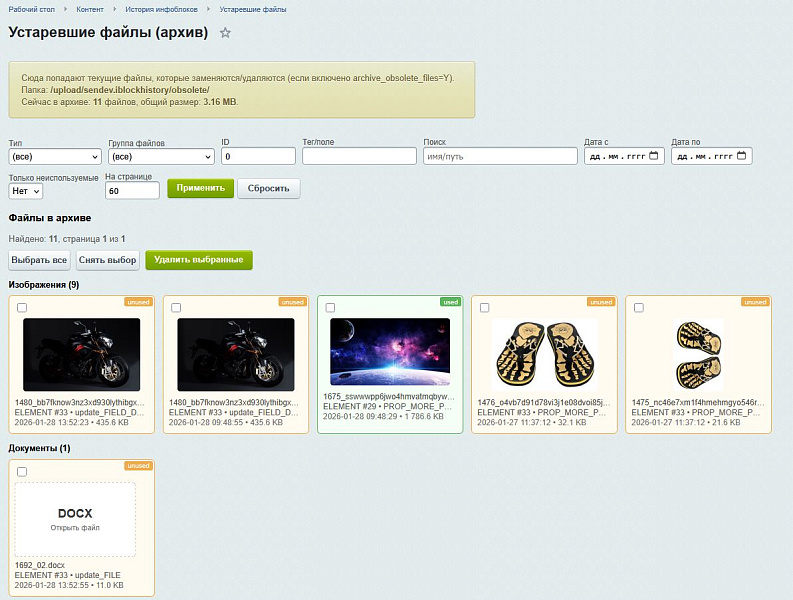 - Исключения: Возможность полностью отключить версионирование для конкретных инфоблоков или полей.