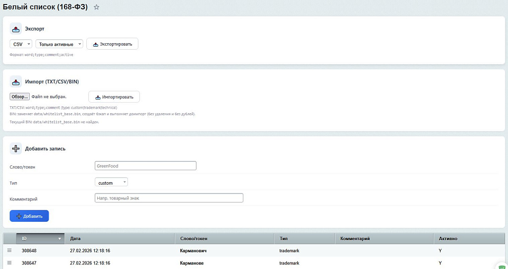 4. Поддерживается ли работа с мультиязычностью? Интерфейс модуля локализован (RU/EN). Проверка контента ориентирована на русский язык (кириллица), так как закон 168-ФЗ касается использования иностранных слов в русском тексте.