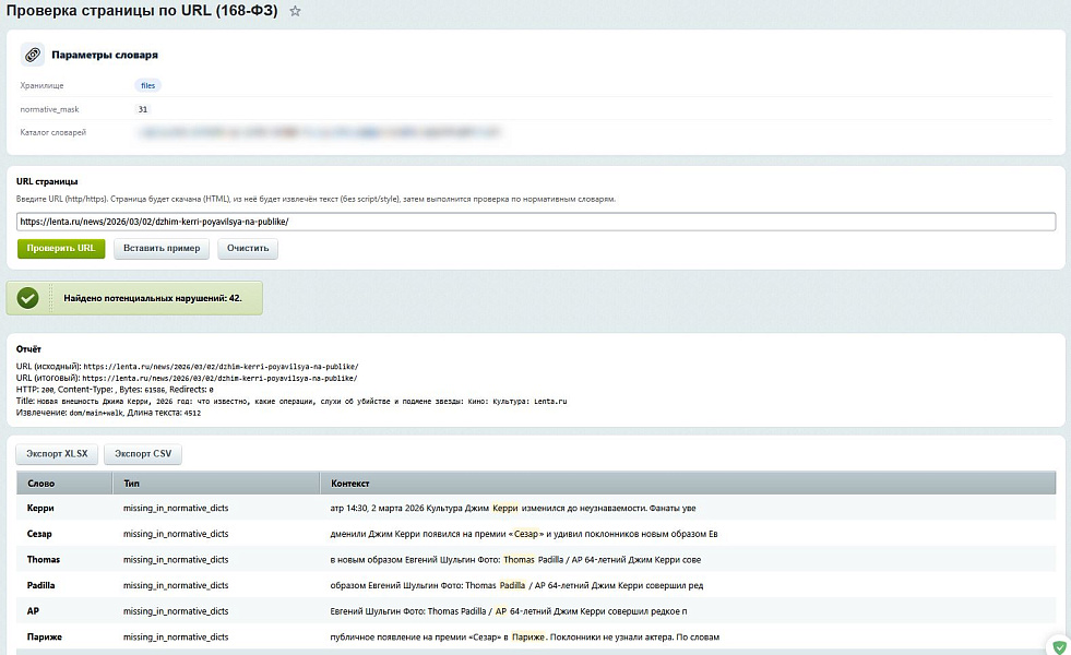 - Соответствие 168-ФЗ: Алгоритмы проверки настроены на выявление слов, отсутствующих в нормативных словарях РФ.